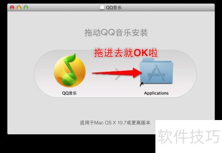 4、 将下载的镜像文件安装后,所示,把图标拖入即可完成。随后在Launchpad中就能看到QQ音乐的图标了。