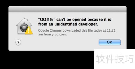 5、 尚未结束,通过启动台进入并点击QQ音乐图标时,本欲运行程序,却发现无法打开,系统弹出提示信息,即便点击确定也无济于事,此时需转而进入Finder中进行后续操作。
