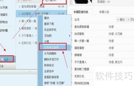 6、 查找音乐文件时,进入我的下载页面,点击已下载,在音乐上右键选择打开所在目录即可定位文件位置。