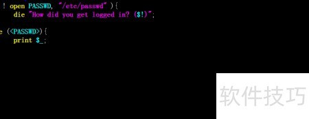 5、 该代码行通过open函数将/etc/passwd文件打开,并将其赋值给文件句柄PASSWD,从而使得PASSWD成为该文件的输入源标识。