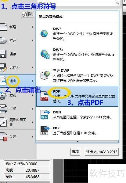 1、 打开CAD软件后,点击左上角的三角形图标,选择下拉菜单中的输出项,再点击PDF,系统将弹出另存为PDF的对话框,供用户保存文件。
