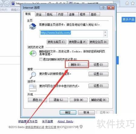 3、 打开Internet选项后,点击浏览历史记录下方的删除按钮,操作所示。
