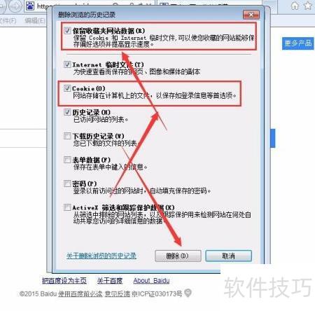 4、 勾选cookies文件选项,然后点击设置窗口下方的删除按钮,即可清除cookies文件,操作方法所示。