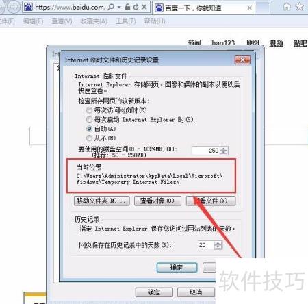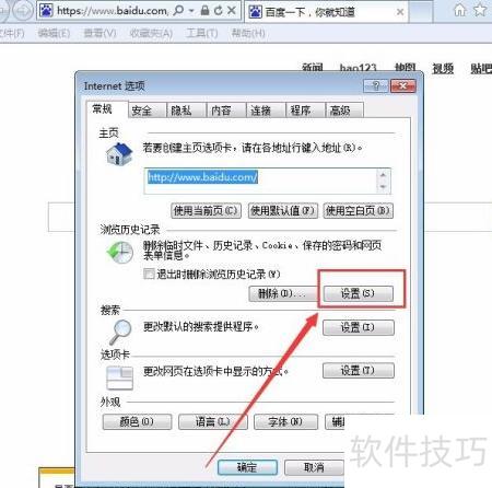 5、 如需查看Cookies文件,可点击Internet选项中浏览历史记录下方的设置按钮,具体操作见图示。