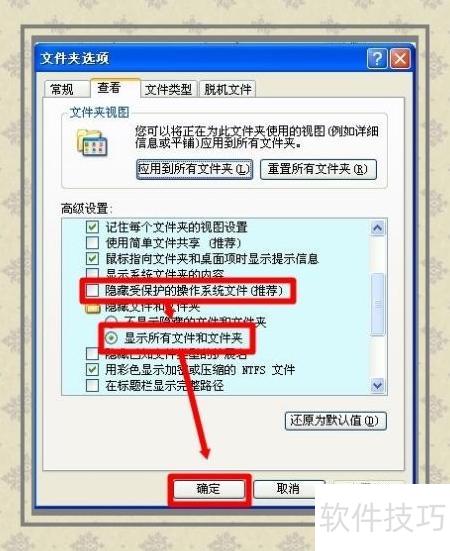 17、 打开控制面板中的文件夹选项,取消勾选隐藏受保护的操作系统文件(推荐),然后选择显示所有文件和文件夹,点击确定即可让系统文件和隐藏文件显示出来。