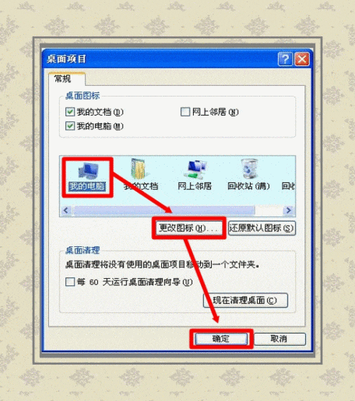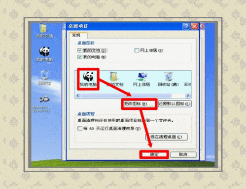 8、 系统默认的电脑、文档、网上邻居和回收站图标能否更换?有没有方法自定义这些图标?