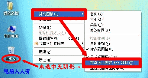 21、 桌面图标出现阴影可能由多种原因引起,可尝试右键点击桌面空白处,取消锁定Web项目来解决。