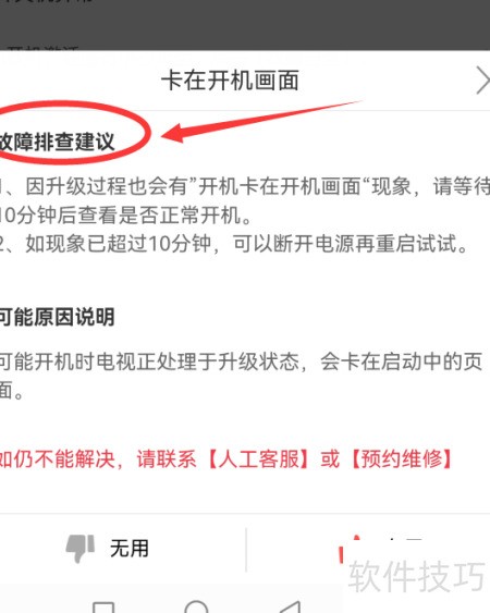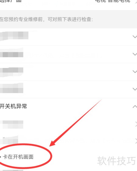 2、 进入智能电视故障排查页面,选择开关机异常,点击卡在开机画面选项。