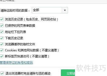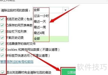 4、 在陵侵系统弹出的清理页面中,选择需清除的上网时间范围和痕迹类型,确认后点击立即清理即可完成操作。