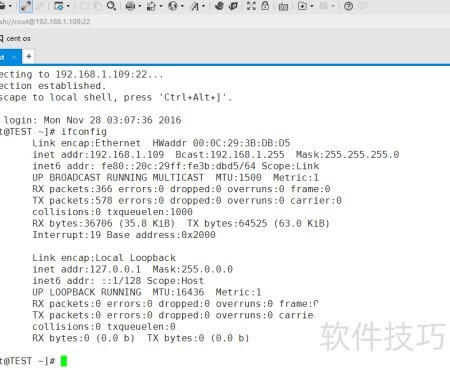 2、 启动CentOS 6.3虚拟机,以root身份登录系统,执行ifconfig命令查询网络配置,获取到当前IP地址为192.168.1.109,该地址属于局域网范围。