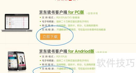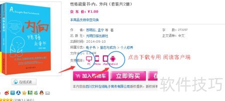 4、 返回之前的商品详情页,由于所购电子书需通过专用阅读器打开,还需下载相应的阅读客户端。页面提供PC、iPhone、iPad及Android四种版本供选择。此次选择下载适用于电脑的PC版和手机端的Android版,具体操作所示。整个过程简单明了,便于在不同设备上同步阅读。