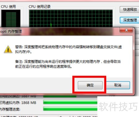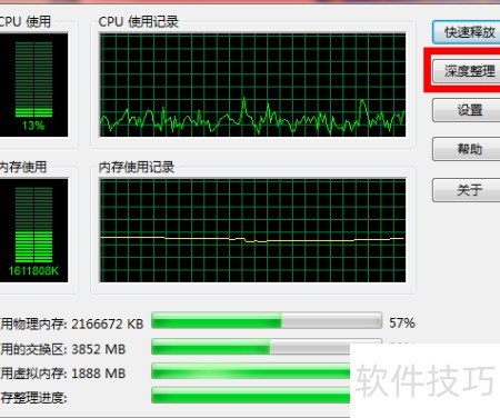 6、 若觉快速释放内存占用仍大,可尝试点击深度整理以进一步优化。