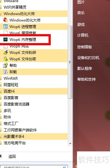 4、 启动程序后,在开始菜单中打开刚安装的Windows优化大师,选择内存整理功能进行操作。