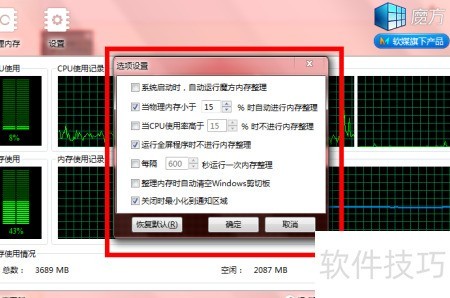 11、 可设置内存整理条件,当内存低于指定值时自动执行。点击设置进行配置,完成后确认即可生效。