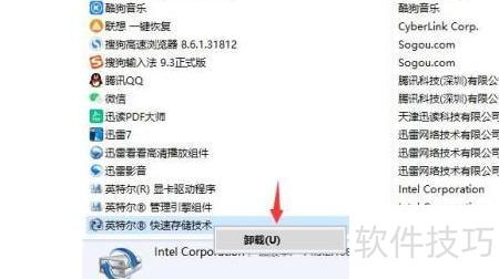 5、 右键点击英特尔快速闪存技术,选择卸载,系统将自动完成卸载过程。