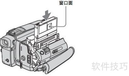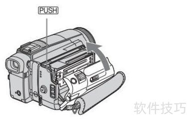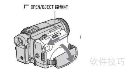 1、 为摄影机装上电池或连接电源后,沿箭头方向滑动开仓键,即可打开卡带仓盖。