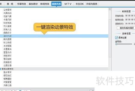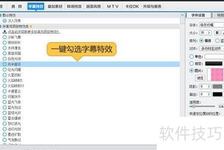 6、 软件内置风中音符、迷幻光斑、墨迹扩散、炫彩繁星等好莱坞级字幕特效,只需在左侧列表一键勾选,即可智能完成渲染,轻松打造电影质感。