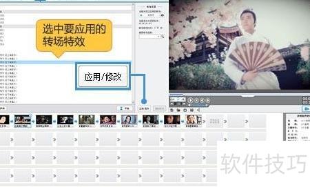 12、 软件内置百余种转场特效,如卷画、翻页、淡入淡出等。在转场特效面板中选择所需效果,点击应用/修改按钮,即可将其添加到选中视频片段上。