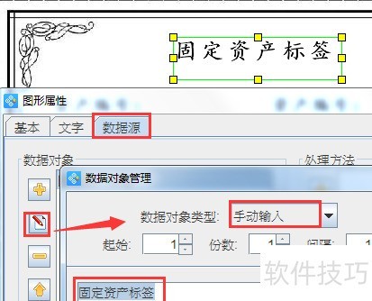 2、 在标签内开始输入内容,选择绘制普通文本功能,在标签上创建文本后双击打开图形属性。进入数据源选项,点击修改,选择手动输入方式,在下方空白处填写所需数据信息,确认无误后点击确定完成设置。整个过程操作简便,便于快速录入和编辑标签内容。