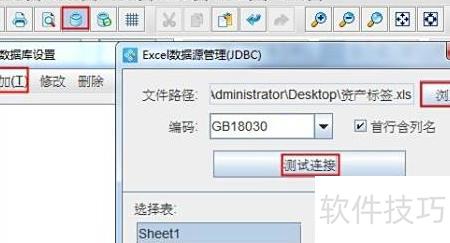 5、 首先打开数据库设置,点击添加按钮,选择对应文件类型。由于文件为Excel表格,故选取Excel数据源选项,随后点击浏览,找到需导入的文件并确认。完成选择后,执行测试连接操作,确保文件读取正常,即可成功将表格中的数据导入系统,整个过程简单快捷,便于后续处理与使用。