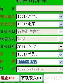 7、 在产品出库单表头界面,通过上下键依次选择购货单位、收货仓库、业务日期、验收及保管信息,所有操作均使用键盘完成。完成表头信息设置后,按下F2键,即可进入物料明细的扫描录入界面。