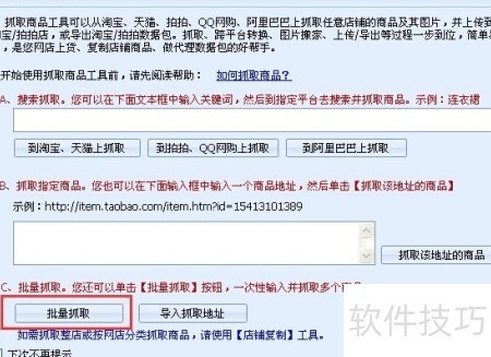 1、 点击使用后会弹出窗口,先准备好需抓取的商品链接,然后利用图中红框标注的批量抓取功能,将链接一次性粘贴并自动识别。