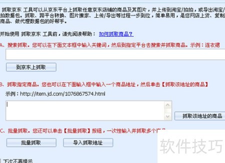 6、 进入京东抓取功能后,从A、B、C三种方式中任选其一进行商品选择。例如选择A,可前往京东平台或其他指定平台,根据界面提示选取需复制的商品完成操作。