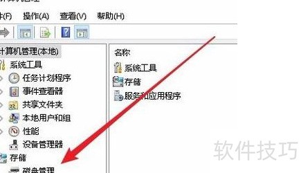 2、 在计算机管理界面左侧选择磁盘管理,进入后续操作。