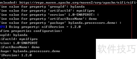 3、 新建一个目录,在该目录下运行 mvn archetype:generate 命令,按照提示输入版本及项目信息。执行完成后,系统将自动生成 NiFi Processor 的项目工程文件,包含所需的结构与配置。
