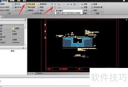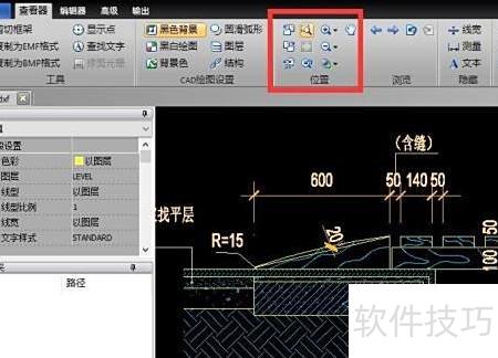 3、 打开DXF文件后,在查看器选项卡中,可点击设置背景为黑色来切换图纸背景颜色,并通过适合窗口功能将CAD图纸以最佳比例显示在当前界面中,便于清晰查看整体布局。