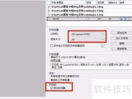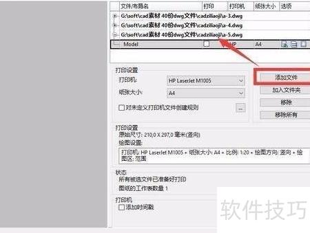 4、 此时会弹出批量打印窗口,点击添加文件按钮,可同时选择多个需要打印的DXF文件,操作界面所示。