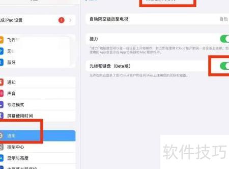 3、 在iPad的设置中选择通用,进入隔空播放与接力,开启光标和键盘功能。