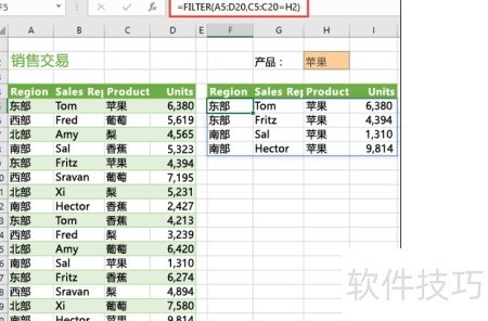 9、 在以下示例中,通过公式 =FILTER(A5:D20,C5:C20=H2,) 可筛选出所有包含苹果(由 H2 单元格指定)的记录;若数据中不存在苹果,则返回空字符串。