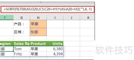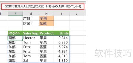 13、 在此示例中,通过结合使用 FILTER 和 SORT 函数,从 A5:D20 数据范围内筛选出产品为苹果且区域为东部的所有记录,并按Units列数值进行降序排列。公式为:=SORT(FILTER(A5:D20,(C5:C20=H1)*(A5:A20=H2),),4,-1),实现条件筛选后排序的综合效果。