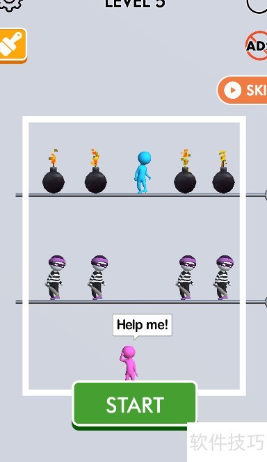 1、 蓝色角色位于地雷内侧,四名敌人处于粉色角色上方,具体位置见示意图。