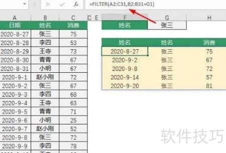 1、 根据条件筛选A2至C31区域中B列等于G1的对应数据。