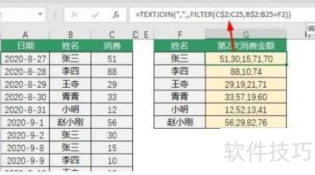 2、 将符合条件的数据用逗号连接,公式为:=TEXTJOIN(,,,FILTER(C\$2:C25,B\$2:B25=F2))。