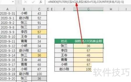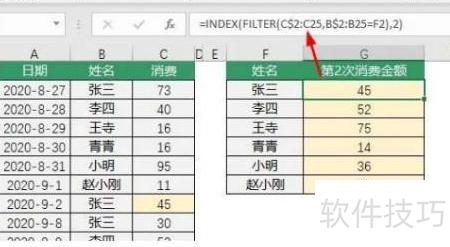 3、 公式为:INDEX(FILTER(C\$2:C25,B2:B25=F2),N),若要查找第二次出现的结果,则使用INDEX(FILTER(C\$2:C25,B2:B25=F2),2)。该表达式通过筛选条件区域并返回指定位置的值。