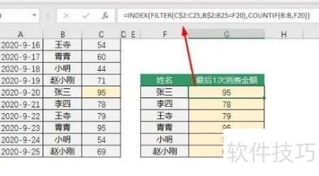 4、 通过筛选B列等于F20的对应C列数据,并结合计数结果,返回符合条件的第N个值。