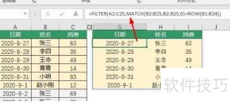 6、 根据条件筛选A2至C25区域的数据,利用MATCH函数匹配B列内容,并通过ROW函数判断行号,实现提取符合条件的唯一记录。
