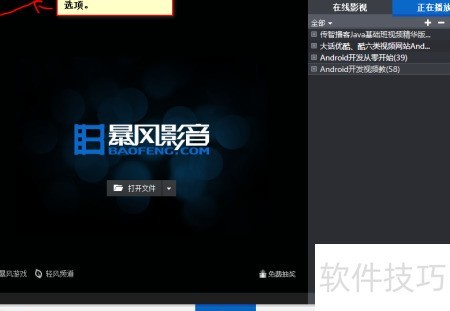1、 点击左上角暴风影音图标,从弹出菜单中选择高级选项即可。