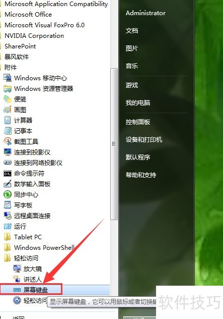 3、 在其下方找到屏幕键盘并点击开启,随后屏幕上会出现键盘界面,显示在桌面位置。