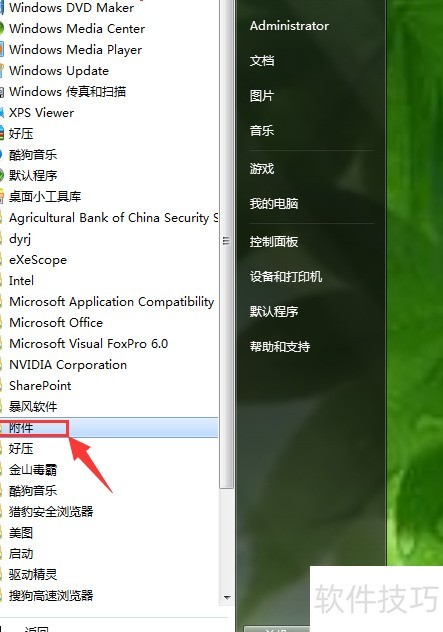 1、 点击桌面开始按钮,进入所有程序,选择附件并打开。