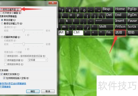 4、 打开屏幕键盘时打字可能会有声音,若需关闭,可点击键盘上的选项按钮,在使用击键声音左侧的复选框中取消勾选即可消除按键音。