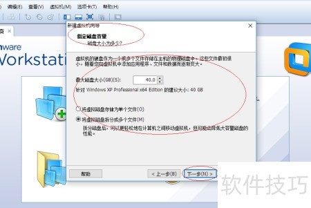 6、 ,出现指定磁盘容量窗口,设定最大磁盘空间,并勾选将虚拟磁盘分割为多个文件选项。
