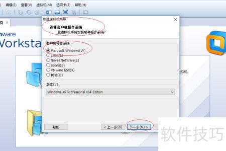 4、 所示,弹出选择客户机操作系统对话框后,选中Microsoft Windows单选按钮,然后点击版本右侧的下拉箭头,在列表中选择Windows XP Professional x64 Edition选项,完成系统版本的设定。