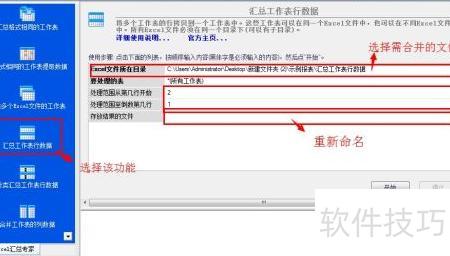 9、 运行完成后,先选中汇总表中的行数据,再选择需合并的文件夹(即新建的文件夹)。默认从第二行至末尾(含表头),若无表头,请从第一行开始选取。