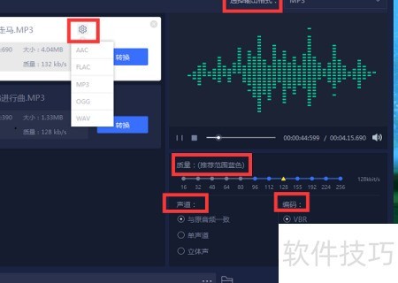 3、 在添加文件后,界面会显示一个设置按钮,用于转换音频格式。点击该按钮,系统将提供五种不同格式供选择,根据需要选定其中一种即可。此外,输出格式也可在此处进行设定。完成格式选择后,下方还提供质量、声道和编辑三项参数调节选项,用户可根据实际需求自行调整各项参数,确保转换结果符合使用要求。