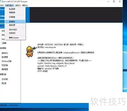 2、 启动DISM++,点击系统备份,设定镜像存储路径即可完成备份设置。