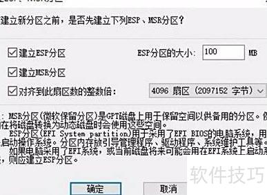 3、 系统还原时,需用软件对目标硬盘重新分区,注意勾选创建ESP和MSR分区。若原为MBR格式硬盘,应先转换为GPT格式后再进行操作。
